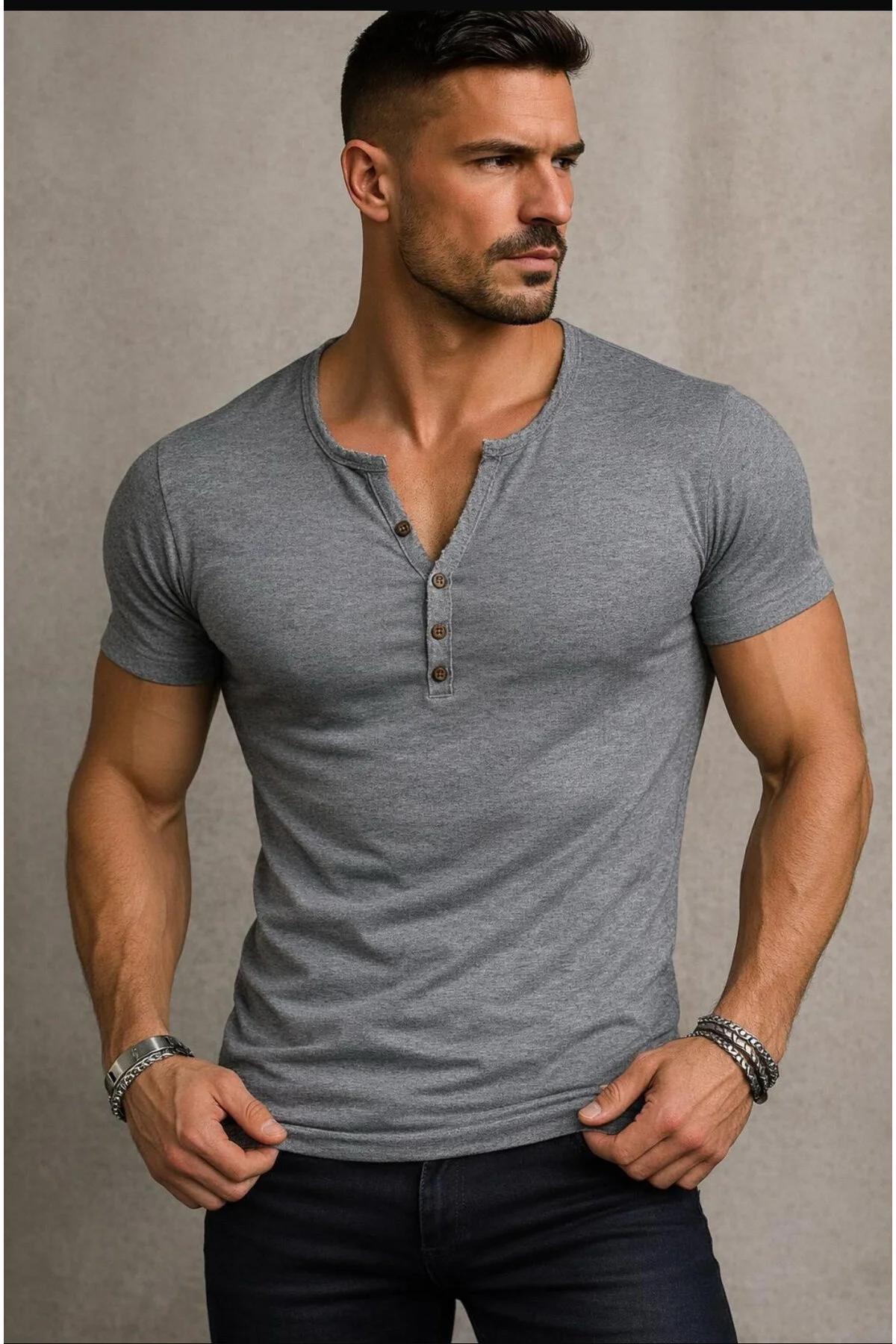 Özel Üretim Füme Henley Yaka Dar Kesim düğmeli Açık Geniş Yaka Tişört T-Shirt