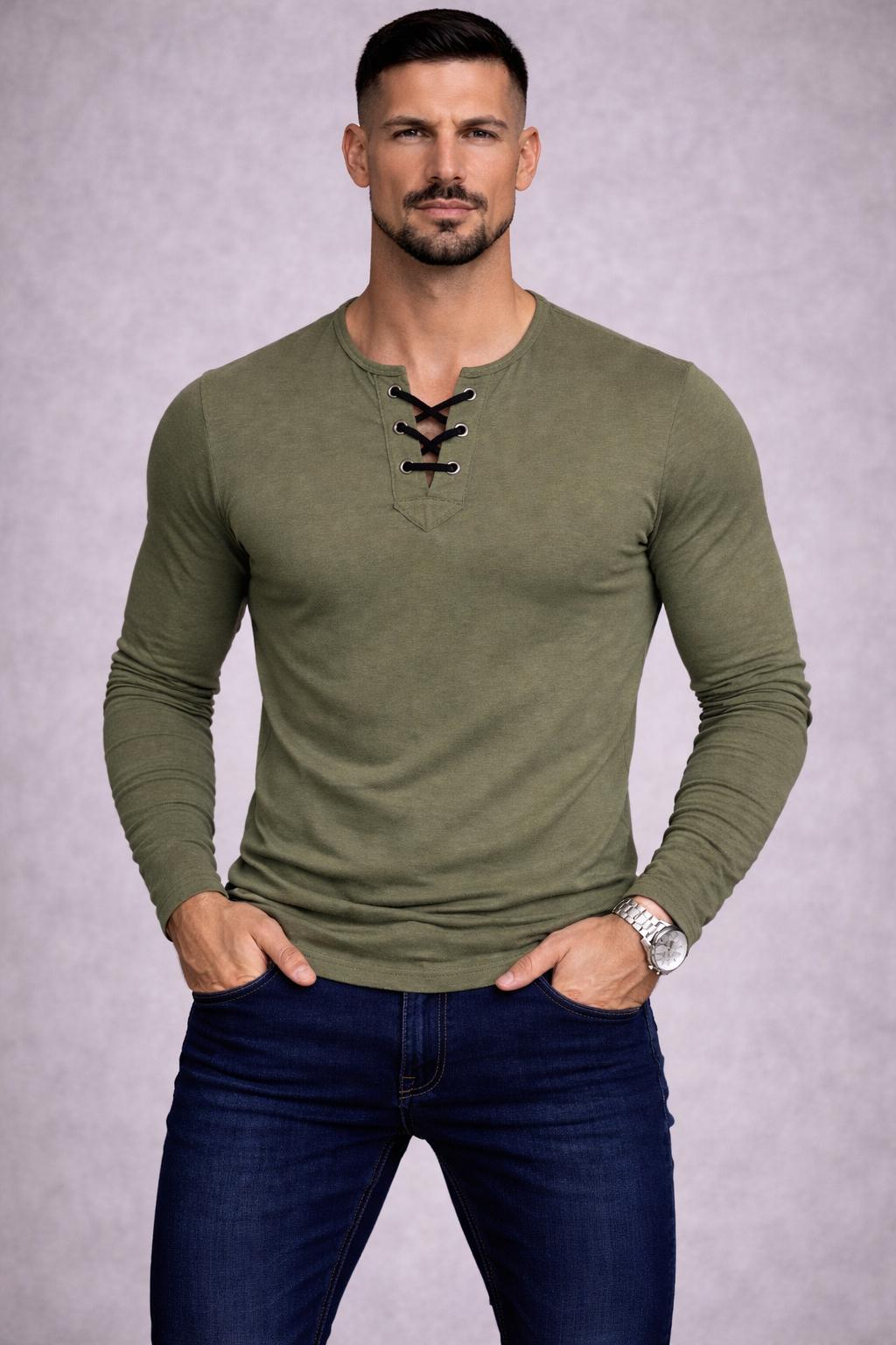 Özel Üretim Haki Yeşil İpli Yaka Dar Kesim Uzun Kollu Geniş Yaka Bisiklet Yaka Tişört Tshirt