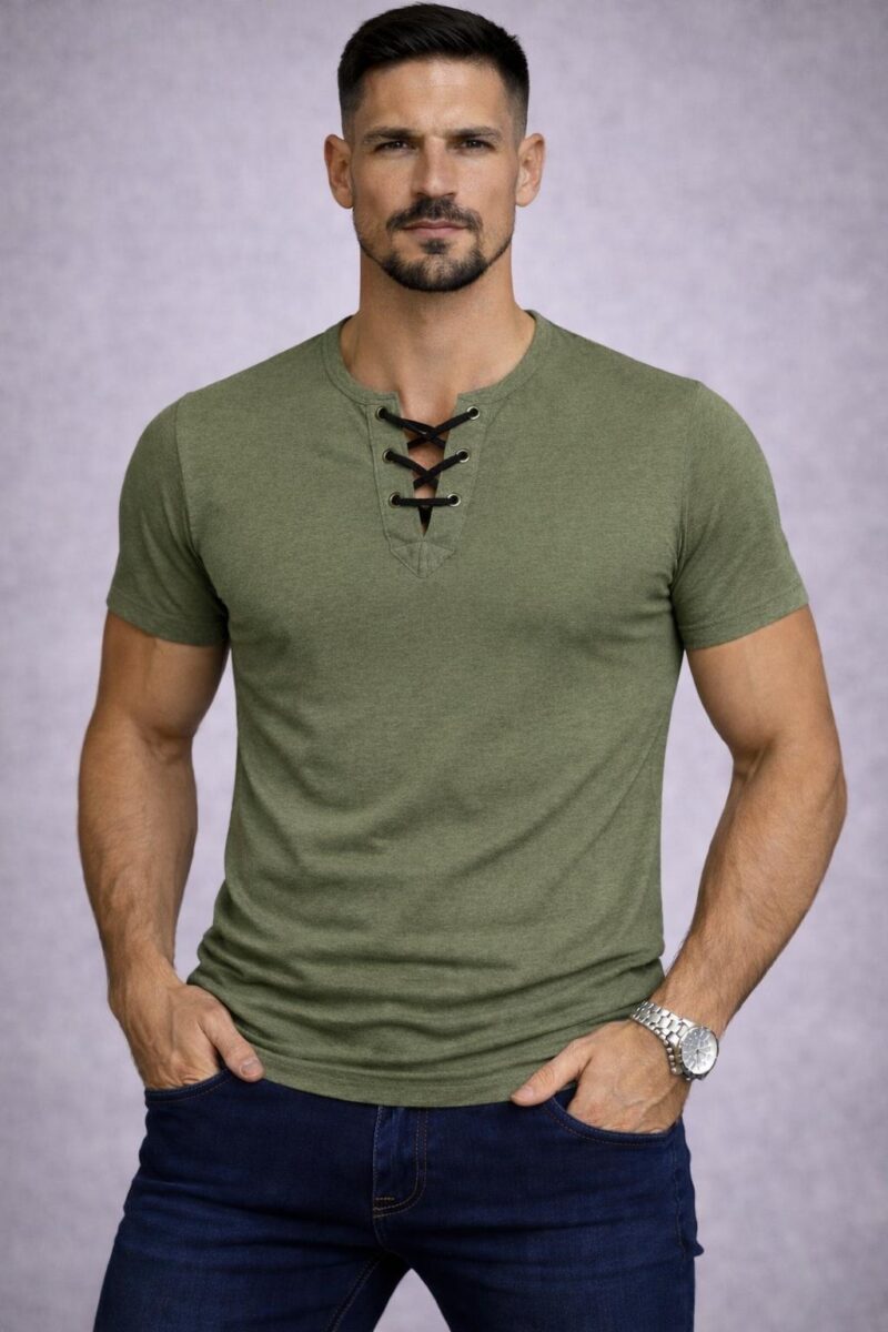 Özel Üretim Haki Yeşil Kısa Kollu İpli Yaka Dar Kesim Geniş Yaka Bisiklet Yaka Tişört Tshirt