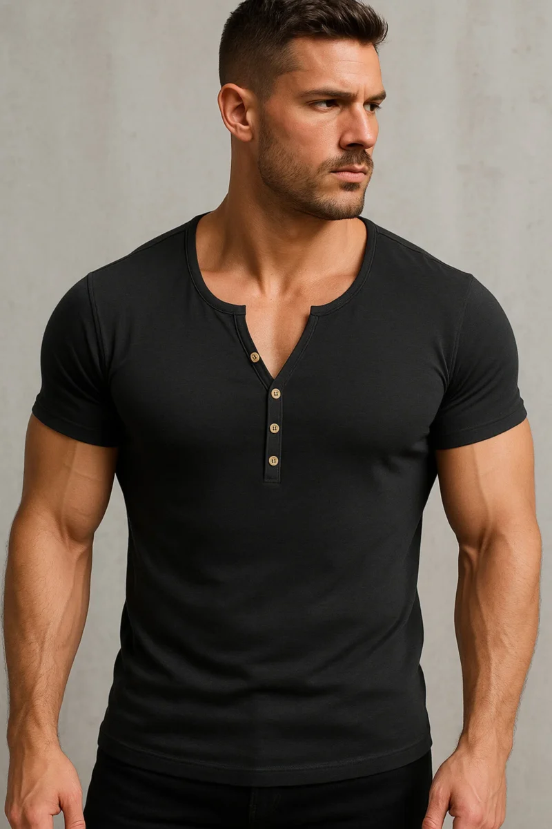 Özel Üretim Siyah Henley Yaka Dar Kesim Düğmeli Açık Geniş Yaka Tişört T-Shirt