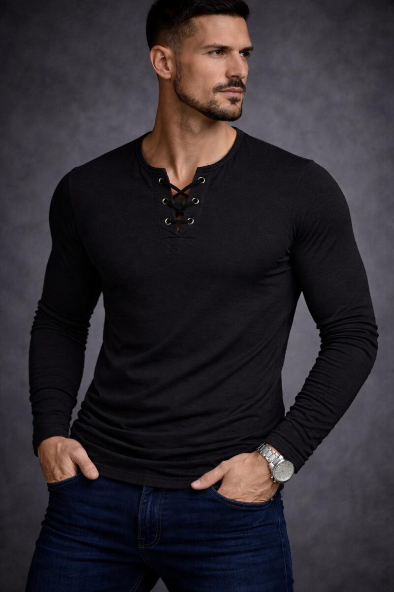 Özel Üretim Siyah İpli Yaka Uzun Kollu Geniş Yaka Bisiklet Yaka Tişört Tshirt
