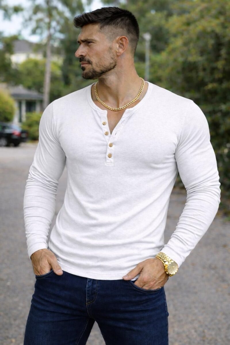 Özel Üretim Uzun Kollu Beyaz Henley Yaka düğmeli Dar Kesim Açık Geniş Yaka Tişört T-Shirt